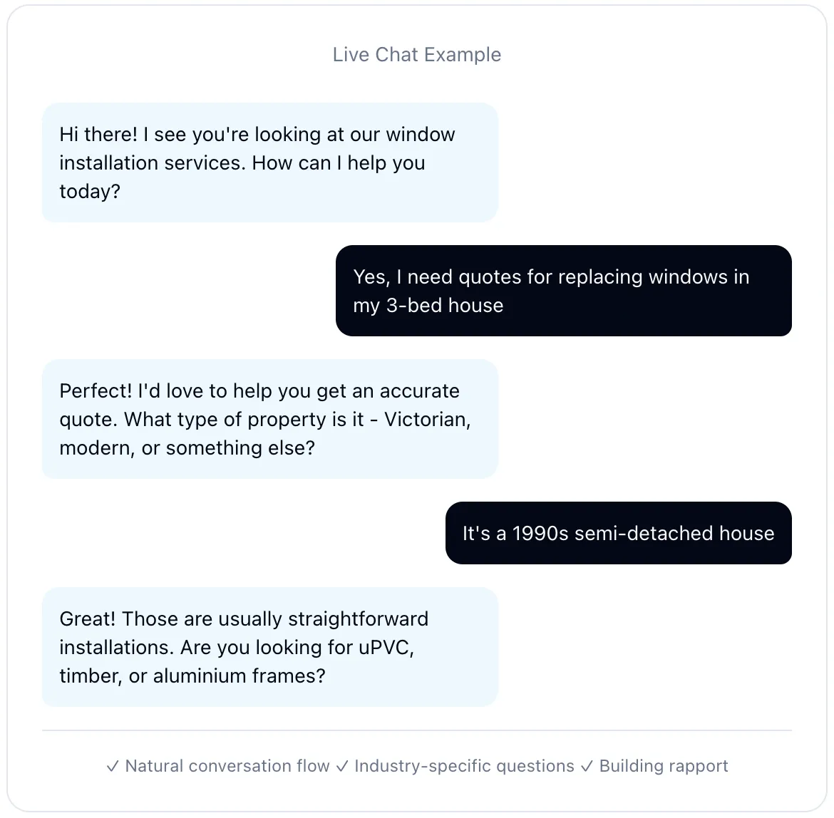 Collects job details, postcode, and the best time to call - filtering out tyre kickers and time-wasters, while turning genuine enquiries into warm, expected conversations.